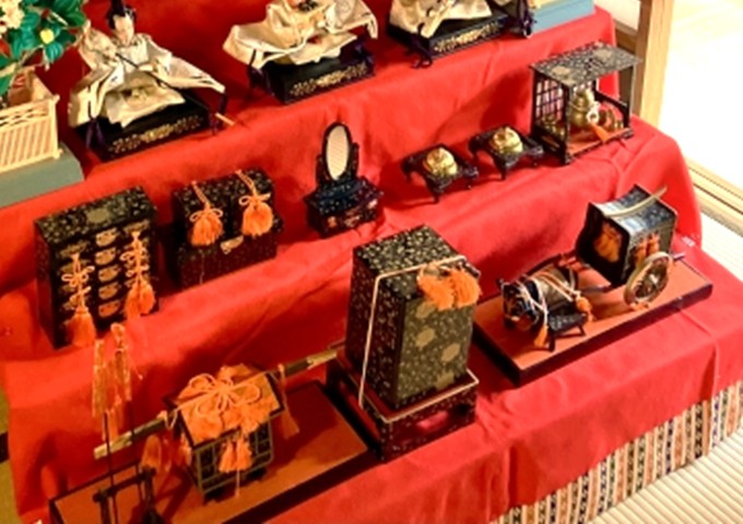 そして公家風15人揃いの雛人形(ひなにんぎょう)と嫁入り道具類を、ひな壇に飾ります。